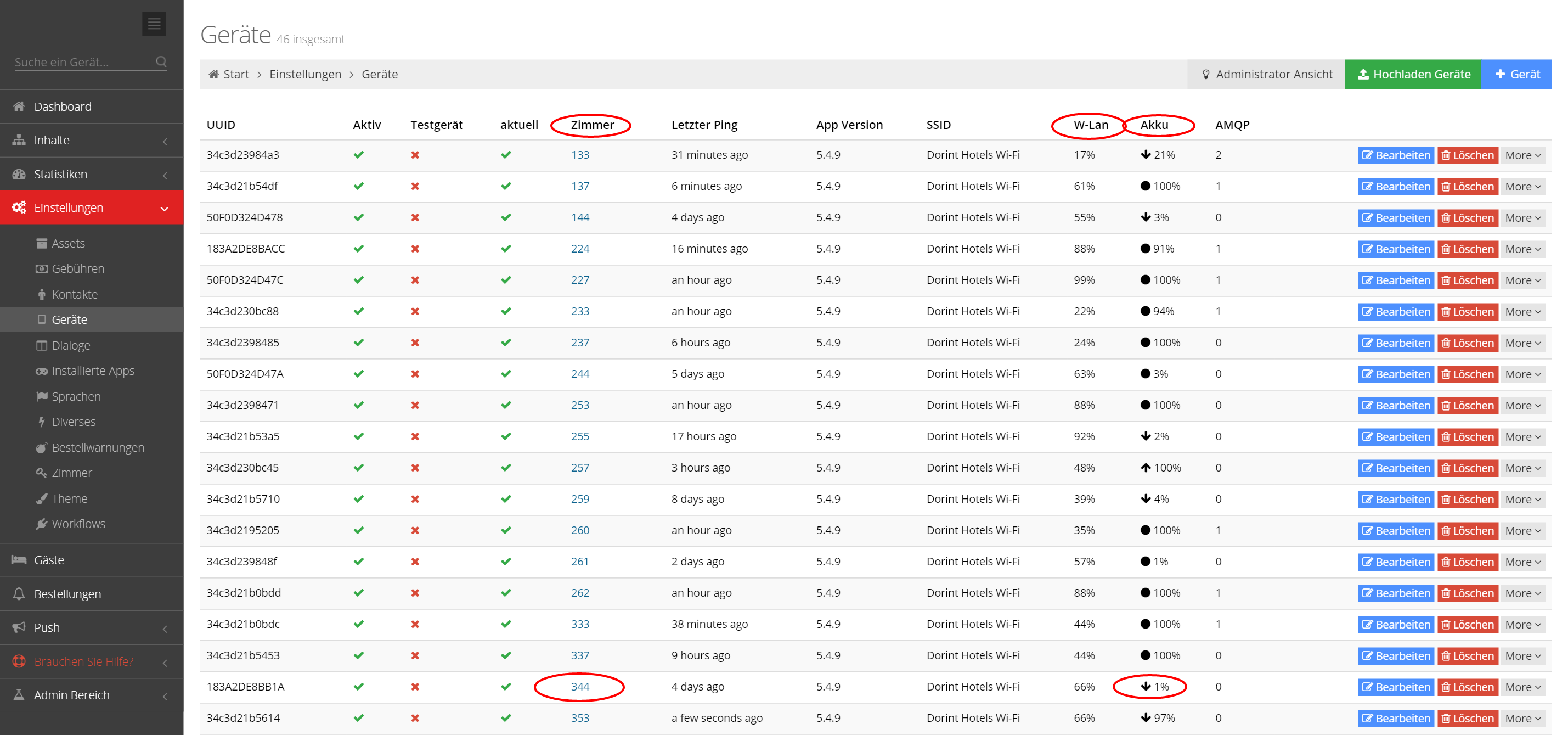 Überprüft werden kann das im Backend des Systems. Dieses Backend lässt sich auf jedem Computer einsehen und somit auch alle SuitePads, die dort in einer Geräteliste hinterlegt sind. Auf dieser Liste kann der Benutzer auf den ersten Blick den aktuellen Status jedes einzelnen Gerätes einsehen und überprüfen, wie stark die WLAN Verbindung und wie hoch der Akkustand ist. Um es noch einfacher zu machen lässt sich eine automatische Benachrichtigung einrichten, welche dem Hotelier täglich per Email eine Liste von Geräten zukommen lässt, die laut der erwähnten Geräteübersicht nicht aktuell scheinen. Diese Benachrichtigung kann nun direkt an den Haustechniker oder die Hausdame weitergeleitet werden, die wiederum sofort und schnell reagieren und die SuitePads vor Ort prüfen und wieder aktualisieren können.