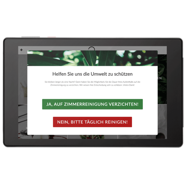 Fördern Sie Nachhaltigkeit, indem Sie Ihren Gästen die Möglichkeit geben, die tägliche Zimmerreinigung direkt über das Tablet abzuwählen – ganz ohne Anruf.
