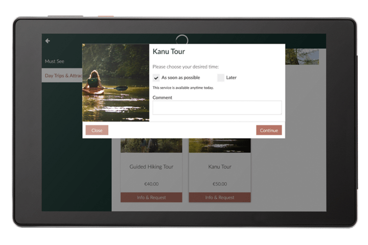 Using the SuitePad in-room tablet, you can efficiently display the activities you offer and enable your guests to conveniently reserve time slots digitally.