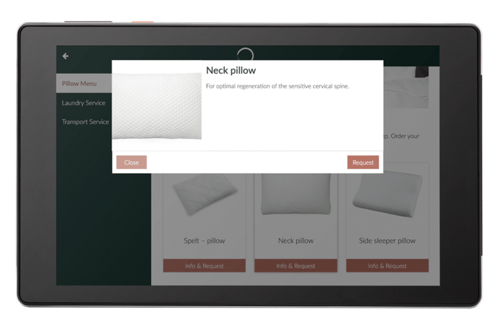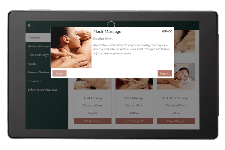 Through the booking tool on the SuitePad In-Room Tablet, your guests have the convenience of adding various additional services, such as room service or spa treatments, around the clock — without the need to visit the front desk or pick up the phone. As a hotelier, this gives you a unique opportunity for upselling directly in the hotel room — an area typically less accessible during your guest's visit. You can boost the active marketing of your offerings through automated and personalized push messages.
