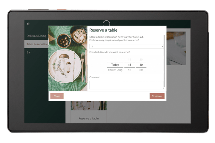 The SuitePad in-room tablet allows your guests to reserve a table at your hotel's restaurant for the number of people and time of day they desire.